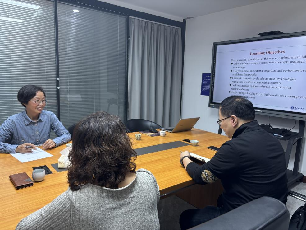 2025 年 11 月 5 日(周三)下午 14:00-17:30,两位专家再次参与课程建设咨询研讨。周莉教授汇报了课程大纲、课件等中英文资源建设进展及实践中的问题,专家在高度认可前期工作的基础上,针对教学组织、案例运用、学习效果评价等细节问题深入点拨,助力课程建设从基础搭建向提质升级稳步推进。