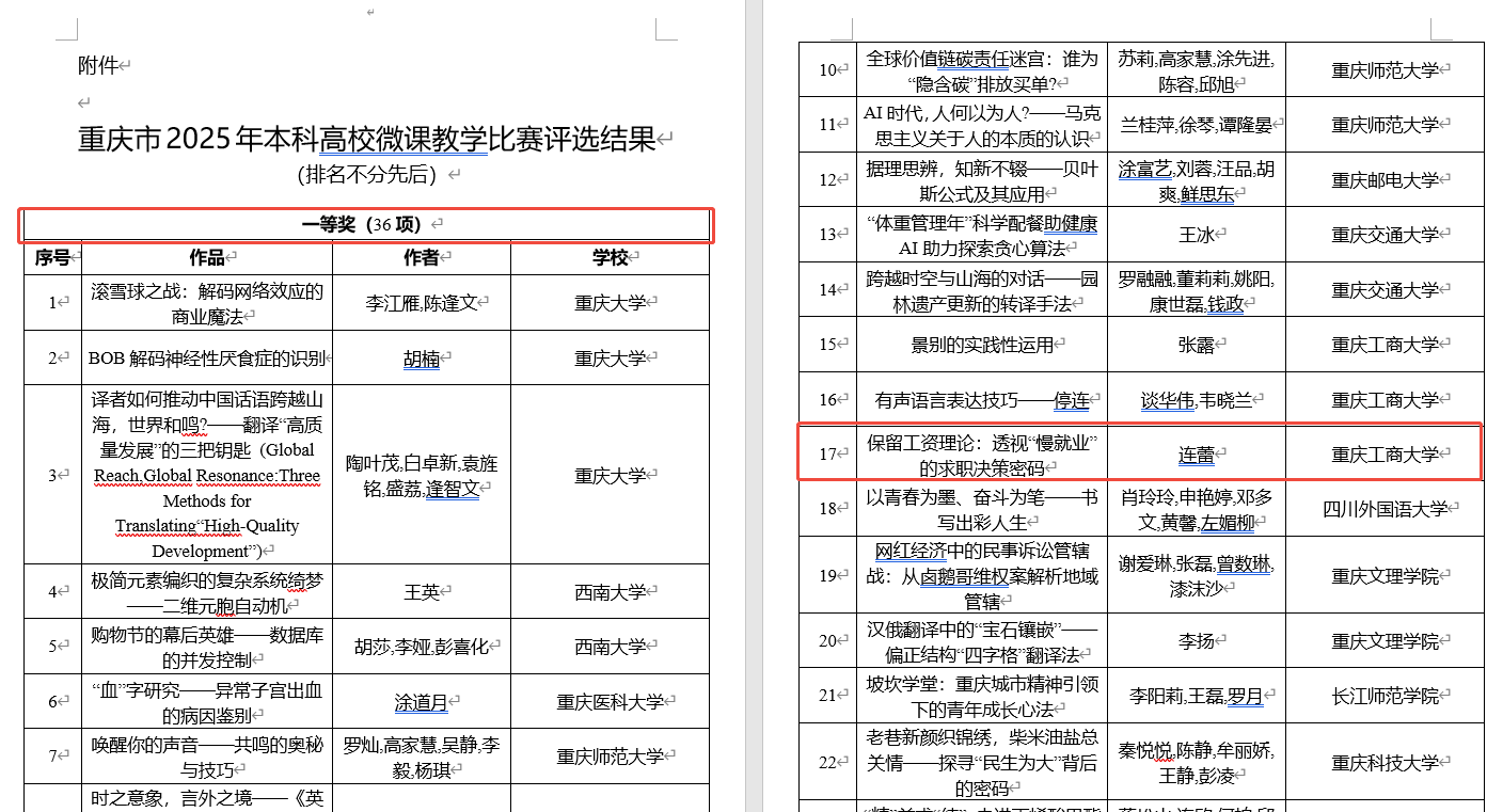 近日,重庆市教育委员会公布了2025年本科高校微课教学比赛获奖结果。公司人力资源管理专业连蕾老师主讲的《劳动经济学》微课作品《保留工资理论:透视“慢就业”的求职决策密码》,荣获大赛一等奖。