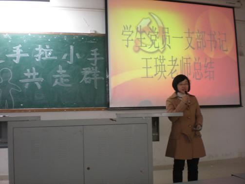 最后,员工党员一支部书记王瑛老师对本次活动进行了总结发言,她期望全体员工党员和入党积极分子要在同学中做好表率作用,特别是员工党员,要努力身先垂范,“党员大手拉小手,同行干群同心路”,提高党组织在同学心目中的美誉度和凝聚力。