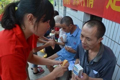实践服务团成员为视障老人送上食物