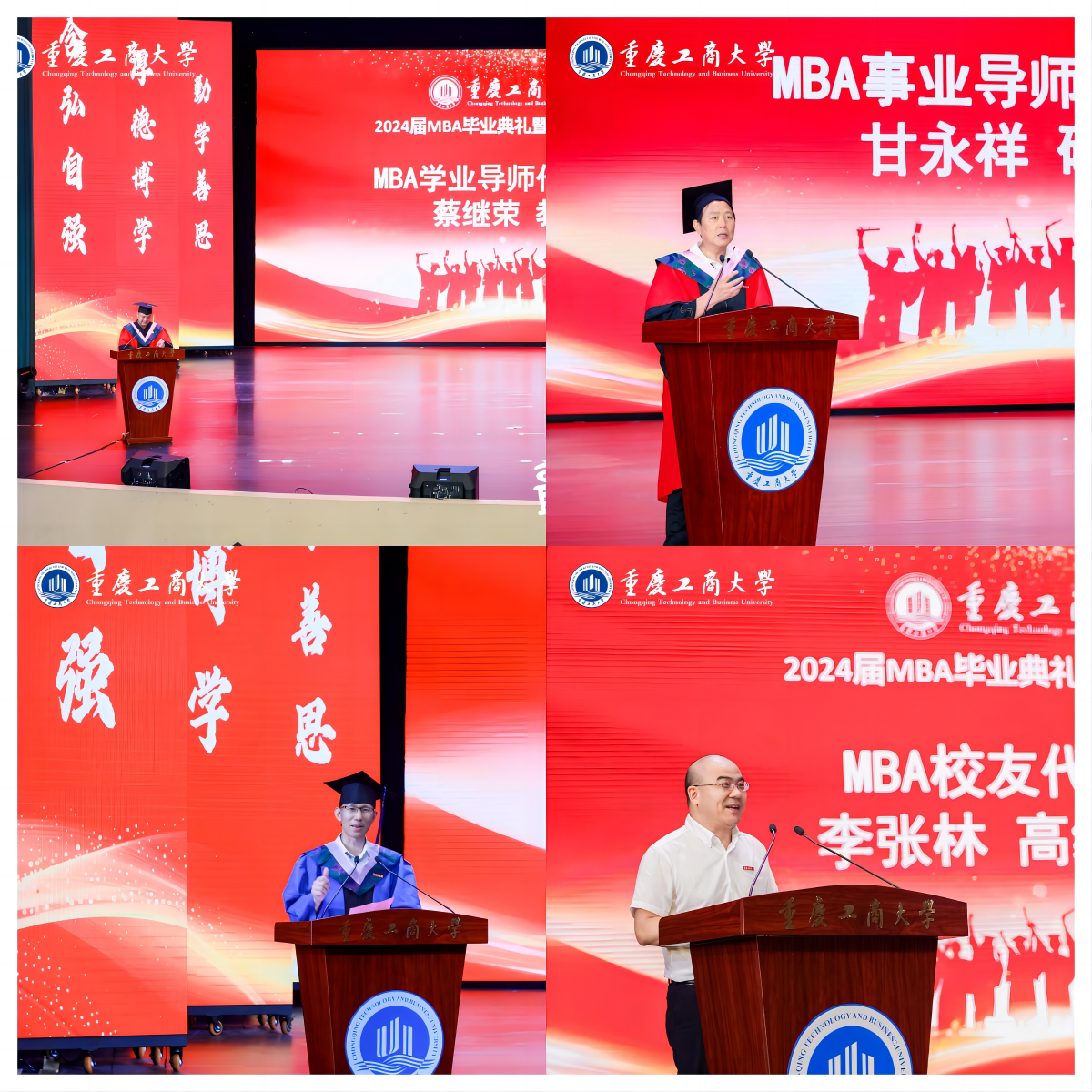 优秀MBA毕业生表彰环节,公司党委副书记程亚宣读了《关于表彰2024年优秀硕士毕业论文作者的决定》,并为获奖同学颁奖。公司党委书记、副经理陈亚惠宣读了《关于表彰2024届校级优秀毕业研究生标兵、优秀毕业研究生的决定》,并邀请英国365上市公司员工会副会长王敬春、赖家国为5名校级优秀毕业研究生标兵、3名优秀毕业研究生颁奖。随后,2024届MBA毕业学员朱伟、2021届MBA员工李张林,分别作为学员、员工代表进行发言,表达了对母校的感恩、对老师的感激和对未来的期许。MBA学业导师蔡继荣、MBA事业导师甘永祥分别作为导师代表,勉励学员们要始终牢记“懂经济、擅管理、宽视野、重责任”这一英国365上市公司MBA重要特质,鼓励学员们要勇于面对新问题、敢于承担更多社会责任。