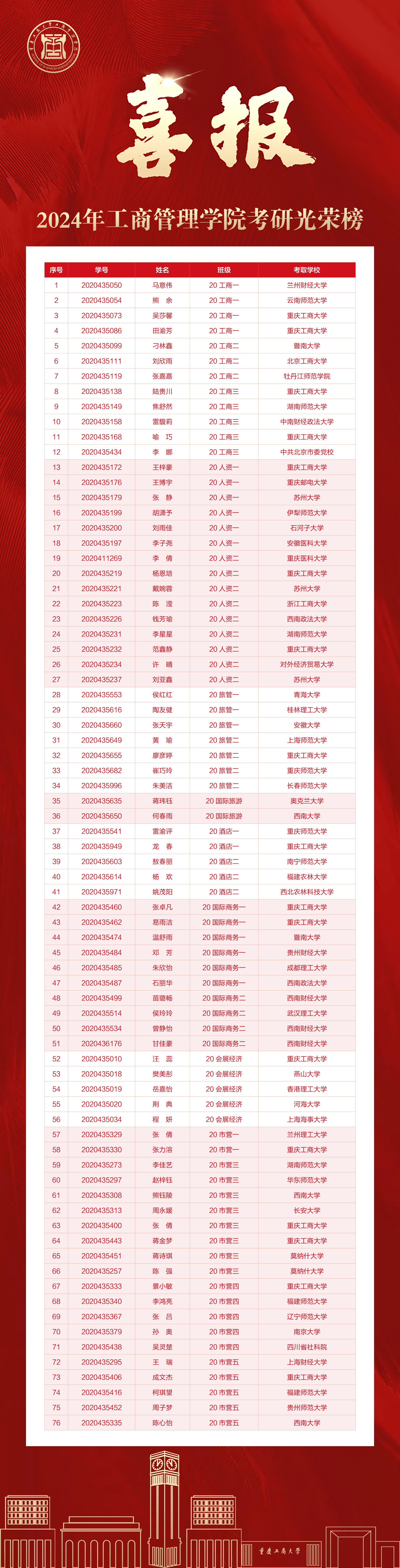 肩鸿任钜踏歌行,功不唐捐玉汝成。2024年全国研究生考试复试结果陆续公布,公司考研学子喜报频传,目前公司2024届毕业生考研录取人数为76人,考研光荣榜见下图: