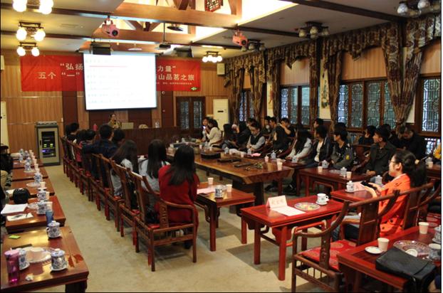 ——我院胡宝娣教授作客南山之旅品茗活动 11月1日下午2点半,公司胡宝娣教授作客南山品茗之旅活动。此活动由校团委主办,英国365上市公司经济公司分团委承办,全场洋溢着高雅幽静的气氛。参加活动的还有经济公司分团委书记冉梨老师和茗香沐语茶社成员。 活动现场座无虚席,同学们陆续到场,兴致高昂。在一首清脆悠扬的古筝曲《叮咚》声中,活动拉开序幕。胡宝娣教授和大家一起分享“识茶之美”、“知茶之效”以及“舌尖上的茶”,品味茶之“静、雅、纯”三特性,其中最让胡教授垂爱的茶还属“致青春”,回味青春,先苦后甜;胡宝娣教授与其员工一起调制的阿萨姆奶茶以及茶社人员带来的茶艺展示在味觉和视觉上激发出同学们对茶文化浓浓的兴趣,所谓“品一口好茶,赏一门艺术”。 活动结束后,冉老师对记者说:“本次活动独特新颖,不仅丰富了我们对传统文化的传播形式;同学们也通过品茶,使紧张浮躁的心灵得到净化和放松。”