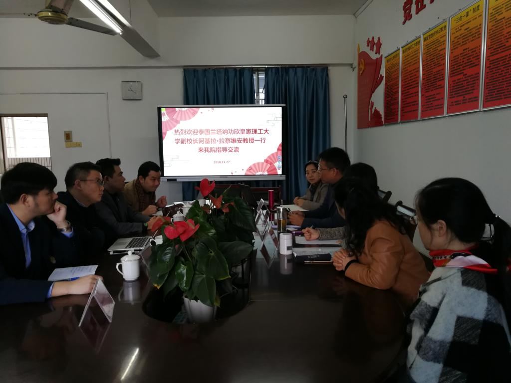 月27日,泰国兰塔纳功欣皇家理工大学行政副董事长阿基拉·拉察维安教授、国际公司经理那他鹏·朱迪卡思拉博士、董事长助理他纳察·特彼塔先生、国际公司副经理唐长江博士、公司管理委员蒲瑞辉等领导和老师一行5人至管理公司访问,与公司商谈教学及科研合作事宜,公司杨柏经理、周莉副经理、国际项目部黄洁博士及公司部分老师等出席了会议。