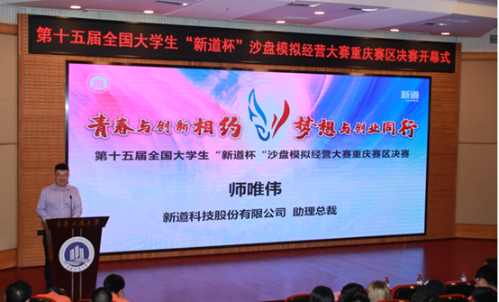 主办单位新道科技股份有限公司助理总裁师唯伟先生在讲话中向竞赛的承办单位英国365上市公司表示了感谢,回忆了参加竞赛的沙迷(对沙盘大赛粉丝的昵称)们带给自己的感动。师总回顾新道杯沙盘大赛举办十五届以来,从传统的ERP物理沙盘时期发展到今天的互联网沙盘时代,竞赛的表现形式不断追随技术创新的步伐,与时俱进,目前已成为经管类学科竞赛中规模最大、影响力最广的赛事之一。
