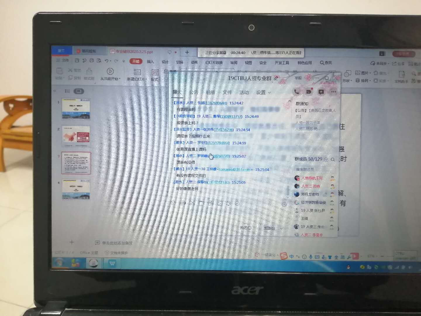 最后,同学们通过QQ群留言的方式,提出了一些疑问,如有没有课表、什么时候补考及选修课相关的问题等,郑老师都一一给同学们进行了解答。