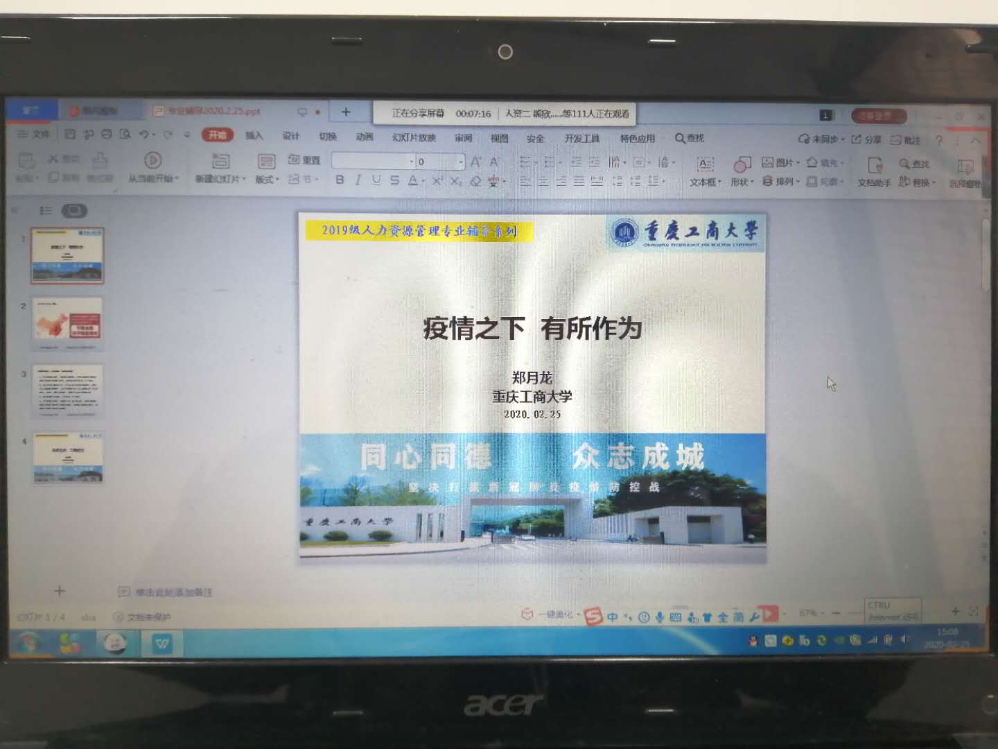 2020年2月25日下午3点以“疫情之下,有所作为”为题,通过QQ群直播平台,专业导师郑月龙博士面向2019级人力资源管理专业员工开展2020年春季学期在线教学前动员。
