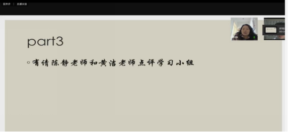 第二阶段,在线学习小组间交流。首先是组长交流,分别由组长舒艳和黄月秋同学分享了所在小组日常活动、特点和管理经验。黄月秋小组的“每日新闻推送,组员资源整合”对知识和应用的融合起到了推动作用,也较好地调动了组员参与的积极性;舒艳小组的“小小组分层管理,每日英语单词背诵打卡,课程笔记分享”创建了小组活跃的学习氛围。其次分别由吴岸洳同学和向双同学分享了小组学习收获及评价。