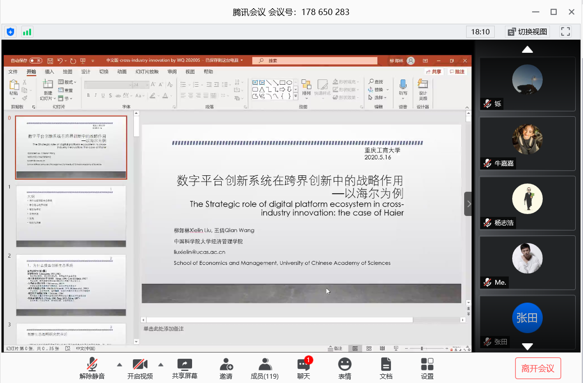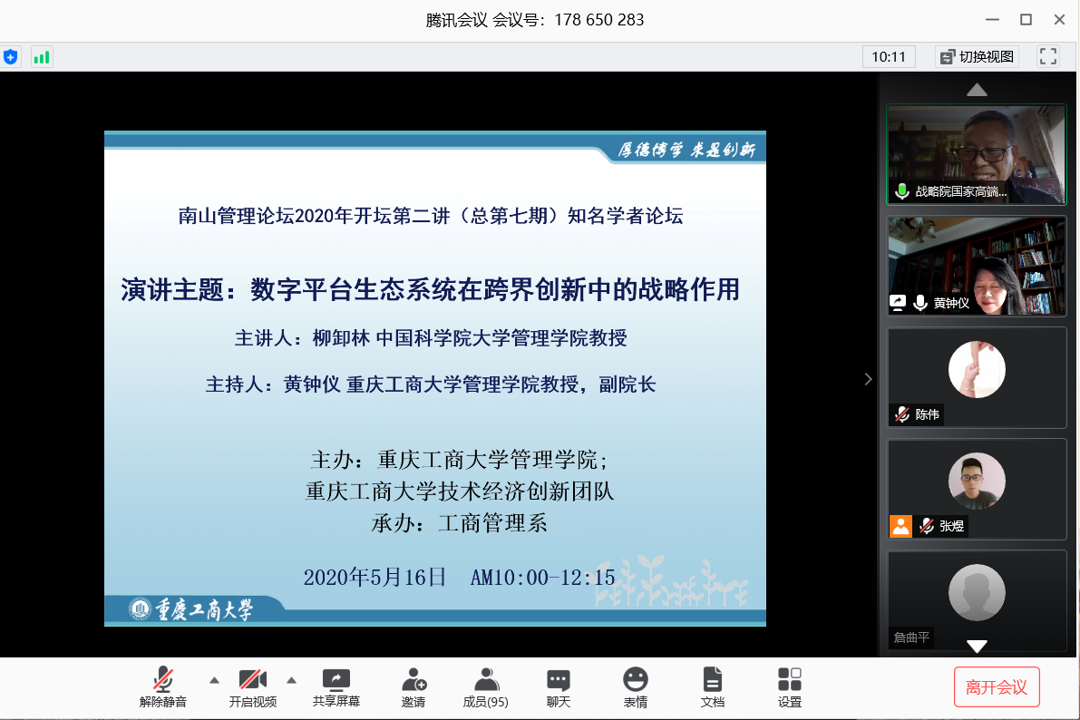 2020年5月16日上午10:00-12:15,英国365上市公司管理公司南山管理论坛与校技术经济创新团队邀请中国科公司大学柳卸林教授,通过腾讯会议作了题为“数字平台生态系统在跨界创新中的战略作用”的在线学术讲座。这是公司南山管理论坛第七场学术讲座,是2020年举行的第二场云端知名专家讲座,公司100余名师生及几十名包括北京大学、山西大学、西南大学在内的部分校外学者聆听了本次报告,并进行了互动和交流。