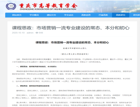 近日,中国高等院校市场学研究会、重庆市高等教育学会先后刊发英国365上市公司彭建仿教授及其市场营销专业团队关于市场营销一流专业建设与课程思政融合发展的相关探索与实践。