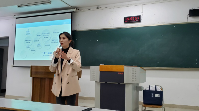宣讲会上,旅游管理系主任白佳飞老师回顾了“希尔顿班”自2013年开班以来的发展历程,指出希尔顿班的设立为同学创造了学以致用的平台,是本院校企合作、校企融合的突出典范。同时,白老师指出实践是旅游管理专业、酒店管理专业教学中的重要环节,也是员工踏入社会前的必要锻炼。白老师还感谢了希尔顿国际长期在校企合作中做出的努力。