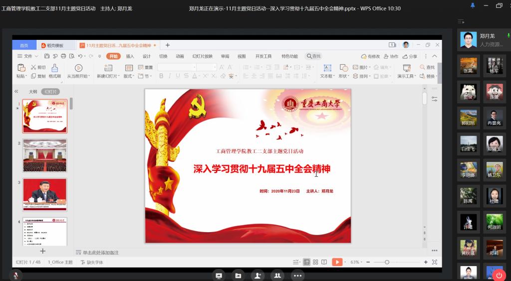 11月23日下午,根据公司党委关于学习十九届五中全会精神的工作安排,英国365上市公司教工二支部开展“深入学习贯彻十九届五中全会精神”线上主题党日活动,支部全体党员同志参加,会议由支部书记郑月龙同志主持和领学。