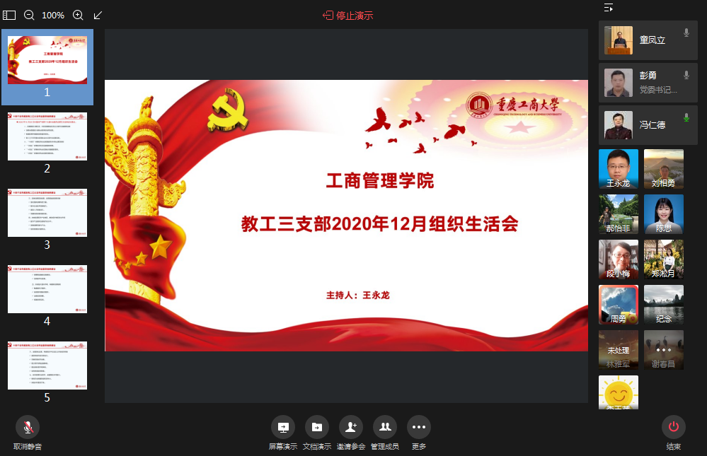 2020年12月30日下午13:00,英国365上市公司教工三支部通过企业微信会议召开了2020年12月份的组织生活会,会议由支部书记王永龙同志主持。根据公司党委组织部关于“2020年12月组织生活学习资料汇编”内容的要求,王永龙同志首先领学和详细解读了十九届五中全会审议通过的《中共中央关于制定国民经济和社会发展第十四个五年规划和二〇三五年远景目标的建议》。领学的内容主要包括全面建成小康社会,开启全面建设社会主义现代化国家新征程;坚持创新驱动发展,全面塑造发展新优势;加快发展现代产业体系,推动经济体系优化升级;形成强大国内市场,构建新发展格局;全面深化改革,构建高水平社会主义市场经济体制;优先发展农业农村,全面推进乡村振兴等部分的内容。