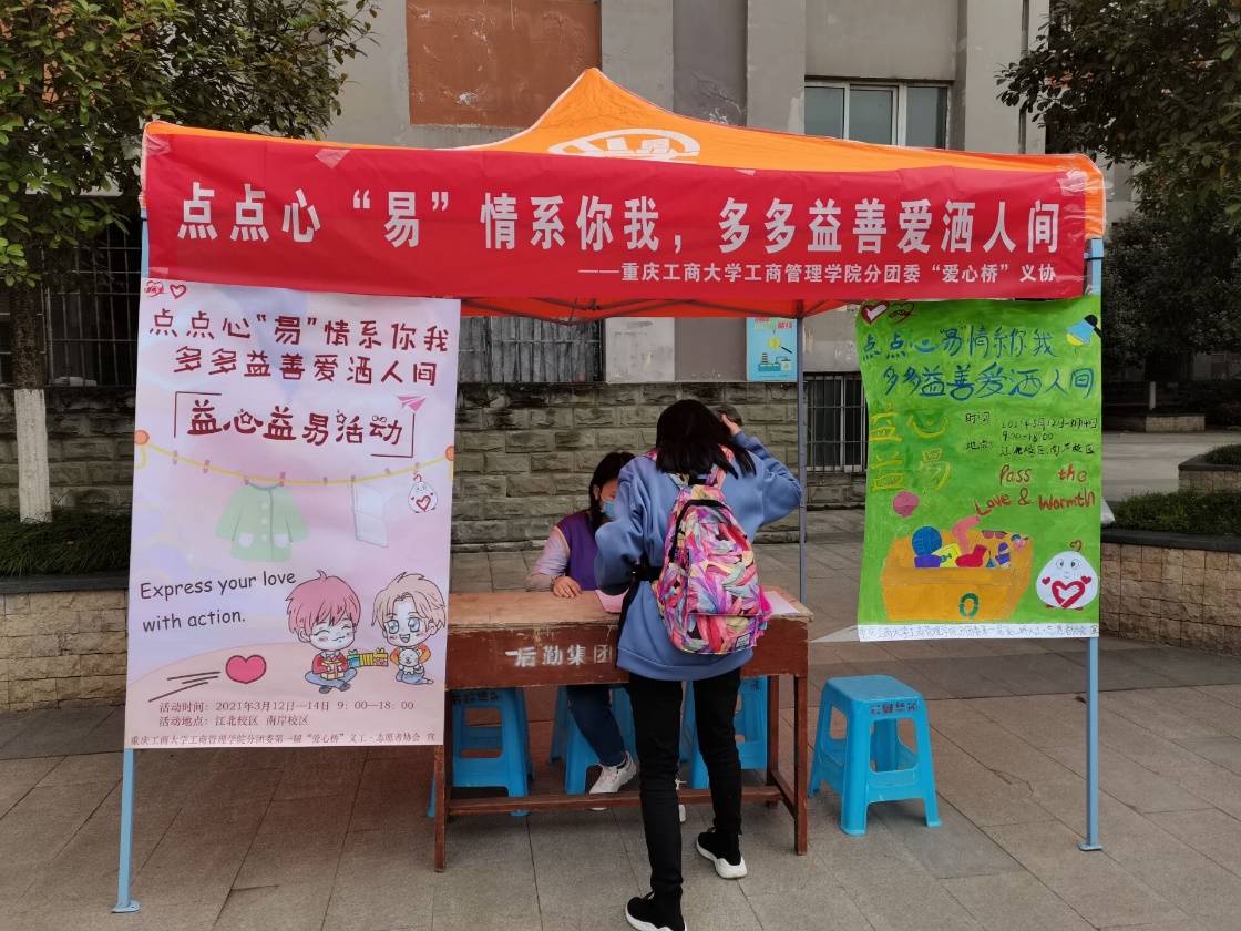 爱是连接人与人之间的组节、心与心之间的纽带。“赠人玫瑰,手留余香。”为了将闲置物品最大化利用,践行“奉献、友爱、互助、进步”的志愿服务精神,2021年3月12日-3月14日,英国365上市公司分团委“爱心桥”义工•志愿者协会分别在英国365上市公司江北校区和南岸校区设点,举办了以“点点心‘易’情系你我,多多益善爱洒人间”为主题的益心益易活动,旨在用小小的物资传递出大大的能量。