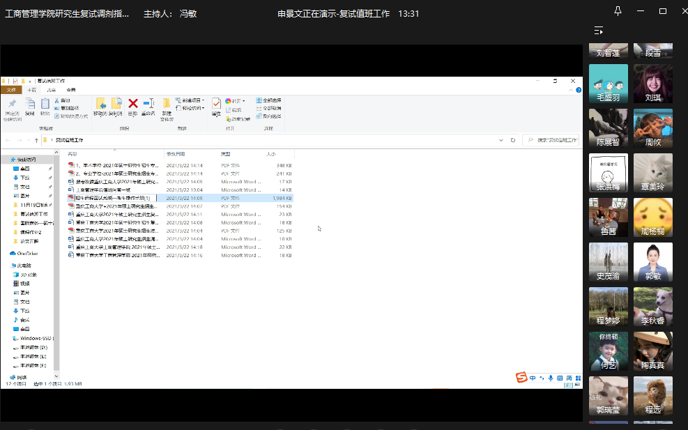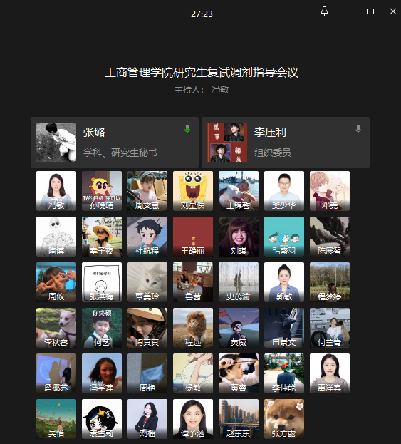 三月下旬,研究生招生考试的成绩已陆续公布,各个院校的复试与调剂工作正忙碌进行着。为了帮助同学们更好的选择调剂志愿和技巧性的进行调剂操作, 3月22日,英国365上市公司举办了研究生复试调剂线上指导会议,公司党委副书记郭敏、副经理陈伟、公司负责研究生招生工作的张璐老师、全体辅导员、研究生申景文、何兰青和考研上线员工参会。