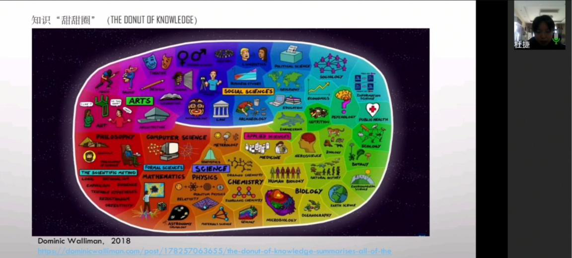 随后,杜老师介绍了新科学新思想产生的规律。最新的科学基于传统的科学;有革命性的思想通常诞生于小团队,大团队则倾向于推进前沿领域研究;以“知识甜甜圈”来深入讲解科学间的联系和规律。