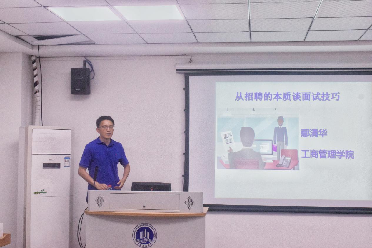 接着是鄢清华老师关于简历制作与面试技巧的分享。鄢老师以现实生活中员工对择偶的标准为例,引出企业招聘的目的与标准,告诉同学们如何才能使自己的已有技能与企业所需相匹配,写出一份吸引企业的简历。鄢老师通过几段相关视频来使同学们深切感知面试的氛围,进一步加深同学们对面试本质的理解,同学们热情高涨,积极讨论。最后,鄢老师还向同学们分享了无领导小组讨论的相关内容,并介绍如何正确面对无领导小组讨论。两位老师都分享结束后,全场响起热烈的掌声,本次活动在主持人的带领下圆满结束。