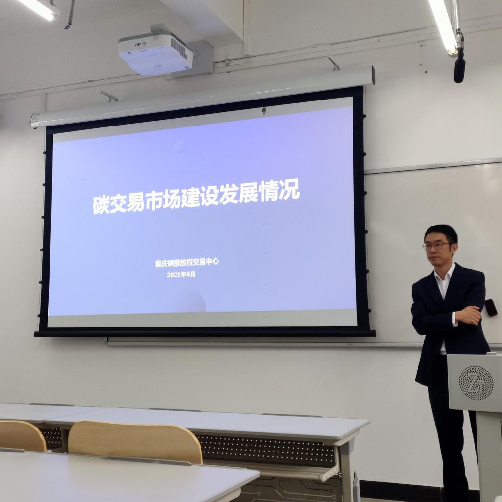 曹竹主任现任重庆联合产权交易所集团土地和资源交易分中心副主任,负责重庆碳交易规则制定、交易平台建设和运营等工作。本次讲座中,曹主任为同学们介绍了实施碳交易的背景,讲解了碳交易基本理论,随后系统分析了我国碳交易试点现状,最后介绍了重庆碳交易试点的情况以及全国统一碳市场建设重庆碳交易试点情况,扩展了同学们对碳交易市场建设发展情况的认知。通过与曹竹主任的讨论和交流,同学们收获颇丰。