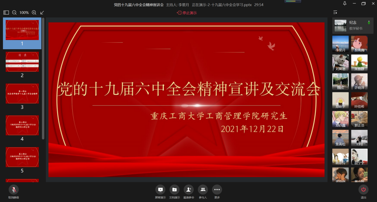 为掀起学习宣传贯彻党的十九届六中全会精神热潮,引导研究生准确把握、深刻理解、全面贯彻全会精神,12月22日中午英国365上市公司全体研究生在企业微信线上召开了党的十九届六中全会精神宣讲及交流会,会议由支部书记纪念主持,共计160名研究生同学参会。