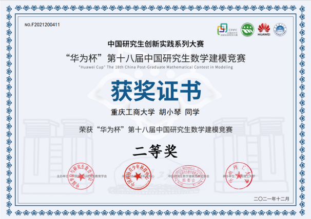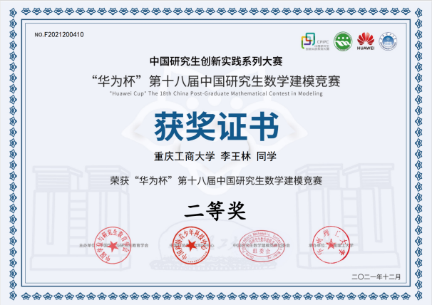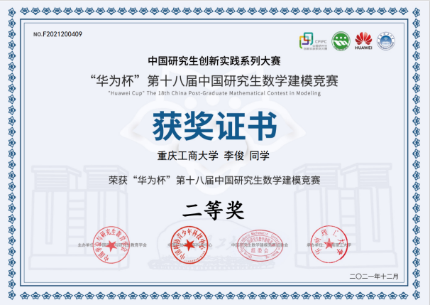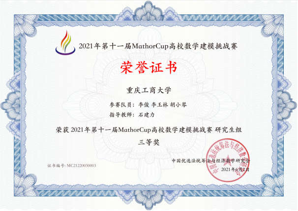 公司企业管理专业硕士研究生李俊、李王林和胡小琴在2021年数学建模竞赛中喜获佳绩,分别获得2021年第十一届MathorCup高校数学建模挑战赛研究生组全国三等奖和“华为杯”第十八届中国研究生数学建模竞赛全国二等奖。