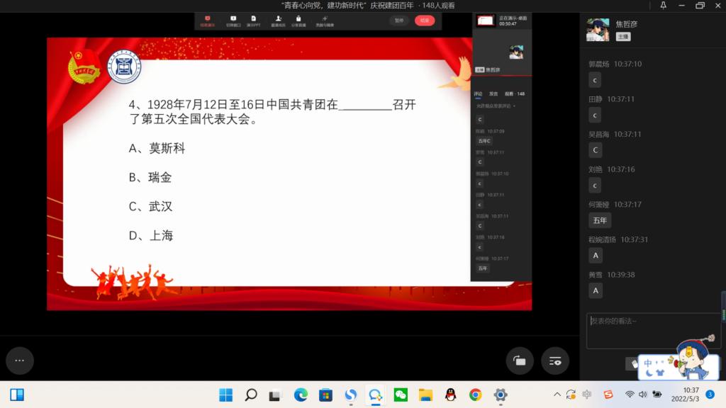 活动伊始,全体与会人员齐唱团歌,而后进入活动第二项“学习团史”,经过对建团百年来的重大历史事件、历史使命的学习,与会人员发表了自己的感受并通过“团史知多少”的环节与主持人进行了积极的线上互动。最后,谭予涵对此次活动进行了总结,希望团干部们坚定理想信念,积极思考、勤奋工作,在学习、工作和生活中留下青春奋斗的鲜明印记。