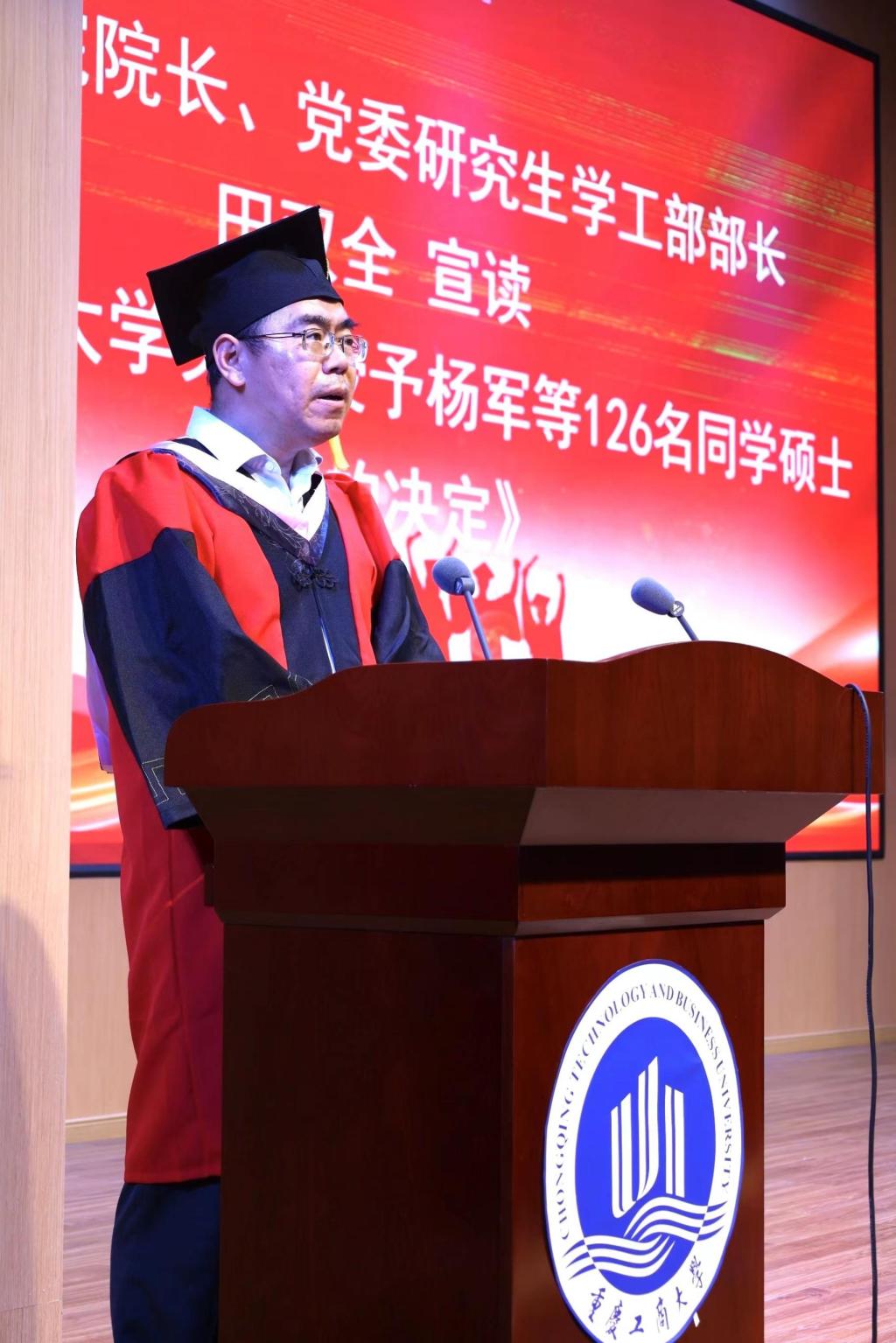2022届毕业典礼在激昂的国歌声中正式拉开了序幕。仪式第一项,2022届MBA毕业生授位仪式环节,研究生院田双全经理宣读了《英国365上市公司关于授予杨军等126名同学硕士学位的决定》。