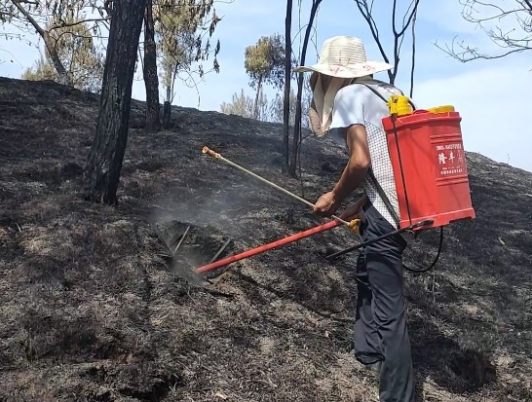 而灭火每队都有队长,听从队长安排,两人一起看见有冒烟的地方就去用工具捅开,喷雾器洒水灭火。悬崖边比较危险,但只要能抵达,志愿者们都是第一个冲上去劈开火点,在火苗阴燃产生明火前及时灭火。