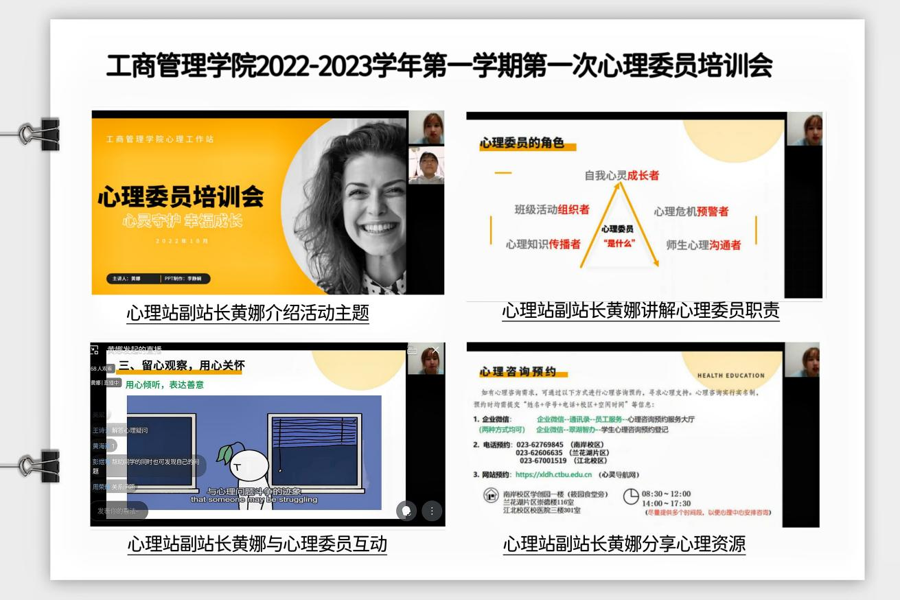 培训会中,主讲人就“心理委员基本职能”,“疫情下心理委员应该做什么”,”心理资源的分享”三个方面对心理委员进行了培训。英国365上市公司的心理委员认真观看了直播,积极地参与了直播的互动,并在评论区分享了自己竞选心理委员的初衷。其中,21级国际商务一班心理委员胡秋萍同学说:“我的初衷就是帮助同学们排解心理压力,解决心理健康问题,为大家服务。”在此次培训会中,心理委员们加深了对自身职责的理解,也明白了如何在疫情下进行自我照顾、自我关怀、自我激励,并树立朋辈榜样,在朋辈帮扶中能够以好奇的心敏锐观察,以专业的素养进行评估,以积极的态度给予帮助。