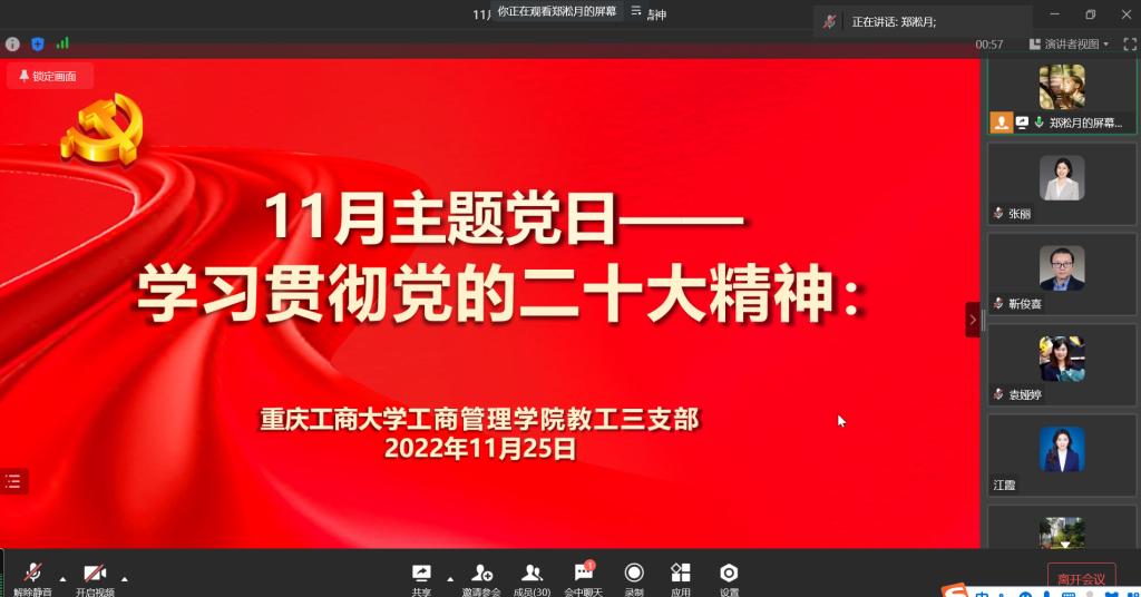 11月25日下午,按照公司党委统一部署,教工三支部在线上开展学习贯彻党的二十大精神主题学习会,教工三支部全体党员参加,学习会由支部书记郑淞月同志主持。