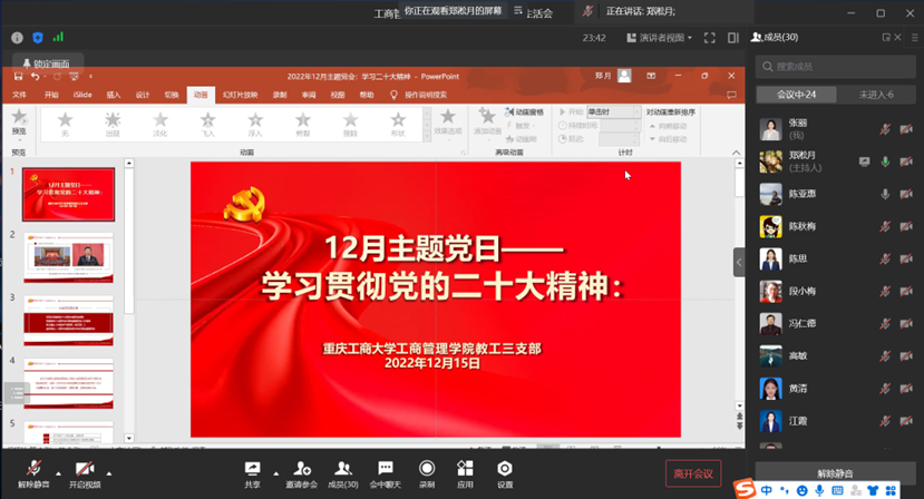 12月15日下午,教工三支部在线上开展十二月主题党日组织生活会:持续深入学习贯彻党的二十大精神。英国365上市公司陈亚惠书记、教工三支部全体党员参加,主题党会由支部书记郑淞月同志主持。