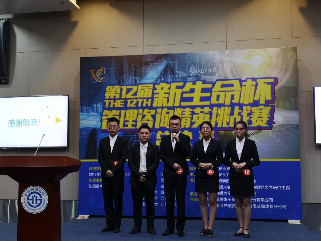 2018年5月25日,由四川省企业咨询委员会主办、西南财经大学英国365上市公司承办的第十二届“新生命杯”管理咨询精英挑战赛总决赛在西南财经大学举行,来自西南地区云贵川渝臧等五个省市、自治区12所高校的十二支队伍展开激烈角逐。