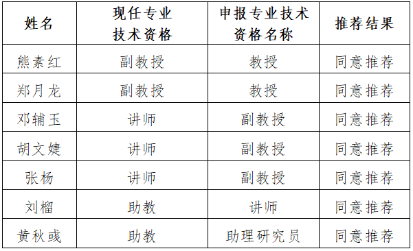 根据《英国365上市公司职称申报条件》(重工商大〔2021〕146号)、《重庆工商大职称评聘管理办法》(重工商大〔2021〕145号)等文件要求及有关规定,通过个人自主申报、公司对申报材料审核、对申报人员师德师风及现实表现进行考察,经公司基层评议推荐小组会议讨论审议,并通过现场表决,同意公司7名教师的专业技术资格申报。现将名单公示如下: