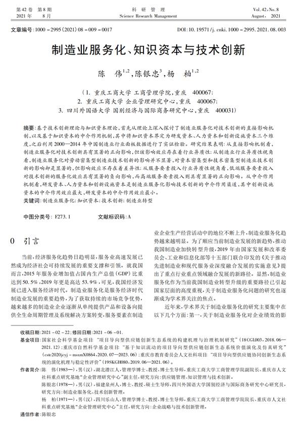 陈伟, 陈银忠, 杨柏. 制造业服务化、知识资本与技术创新[J]. 科研管理(国家自然基金委管理科学部认定的A级重要期刊). 2021, 42(8): 17-25.