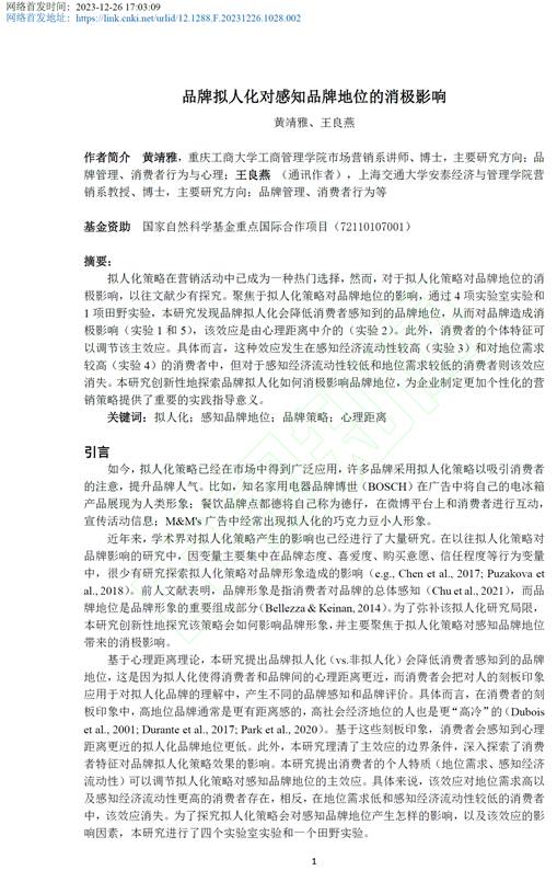[1]黄靖雅,王良燕.品牌拟人化对感知品牌地位的消极影响[J/OL].南开管理评论:1-19[2024-01-08].