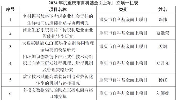 近期,重庆市自然科学基金面上项目申报结果出炉,公司在立项数量上取得了历史性突破。其中,陈伟教授、蔡继荣教授、孟炯教授、郑月龙教授、杨红教授、刘娜娜博士等6位老师喜获重庆市自然科学基金面上项目资助。