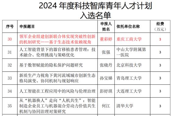 近期,中国科协战略发展部、中国科协创新战略研究院发布了《关于申报2024年度“科技智库青年人才计划”的通知》,根据中国科协项目管理有关规定,经组织专家形式审查和综合评审,共评选出180项。其中,公司董彩婷博士提交的《领军企业组建创新联合体实现突破性创新的机制研究——基于生态技术依赖视角》喜获“科技智库青年人才计划”立项资助。
