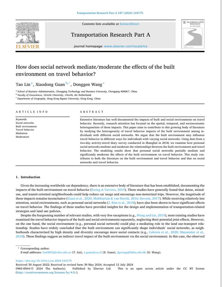 Tao Lin, Xiaodong Guan, Donggen Wang, How does social network mediate/moderate the effects of the built environment on travel behavior?, Transportation Research Part A: Policy and Practice, 2024, 187:104175.(ABS 3星期刊,中科院SCI一区Top期刊)