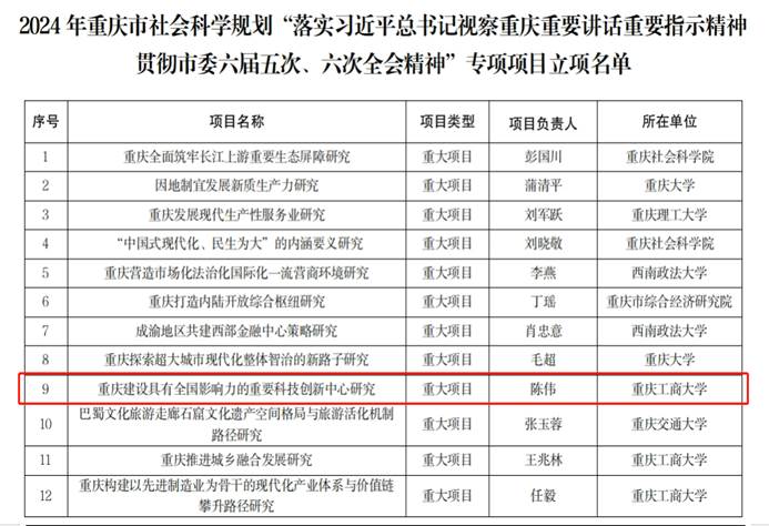 近期,2024年重庆市社会科学规划“落实习近平总书记视察重庆重要讲话重要指示精神贯彻市委六届五次、六次全会精神”专项项目评审结果出炉,公司教师陈伟教授获批“重大项目”1项,这也是陈伟教授主持的“2022年重庆市社会科学规划成渝地区双城经济圈建设重大项目”顺利结题后获批的又一项省部级重大项目。