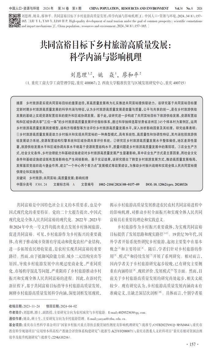 刘愿理,姚焱,廖和平.共同富裕目标下乡村旅游高质量发展:科学内涵与影响机理[J].中国人口·资源与环境, 2024, 34(08):157-165.
