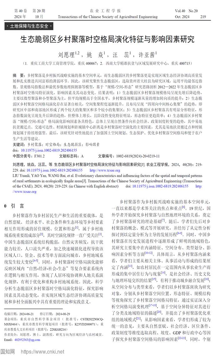 刘愿理,姚焱,汪蕊,等.生态脆弱区乡村聚落时空格局演化特征与影响因素研究[J].农业工程学报, 2024, 40(20):219-229.
