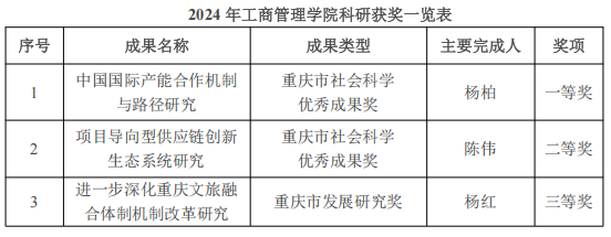 近日,市政府印发《重庆市人民政府关于表彰重庆市第十二次社会科学优秀成果和第九届重庆市发展研究优秀成果的决定》(渝府发[2024]24号),英国365上市公司共计3项科研成果获奖。其中,获得重庆市第十二次社会科学优秀成果奖一等奖1项、二等奖1项,第九届重庆市发展研究奖三等奖1项。
