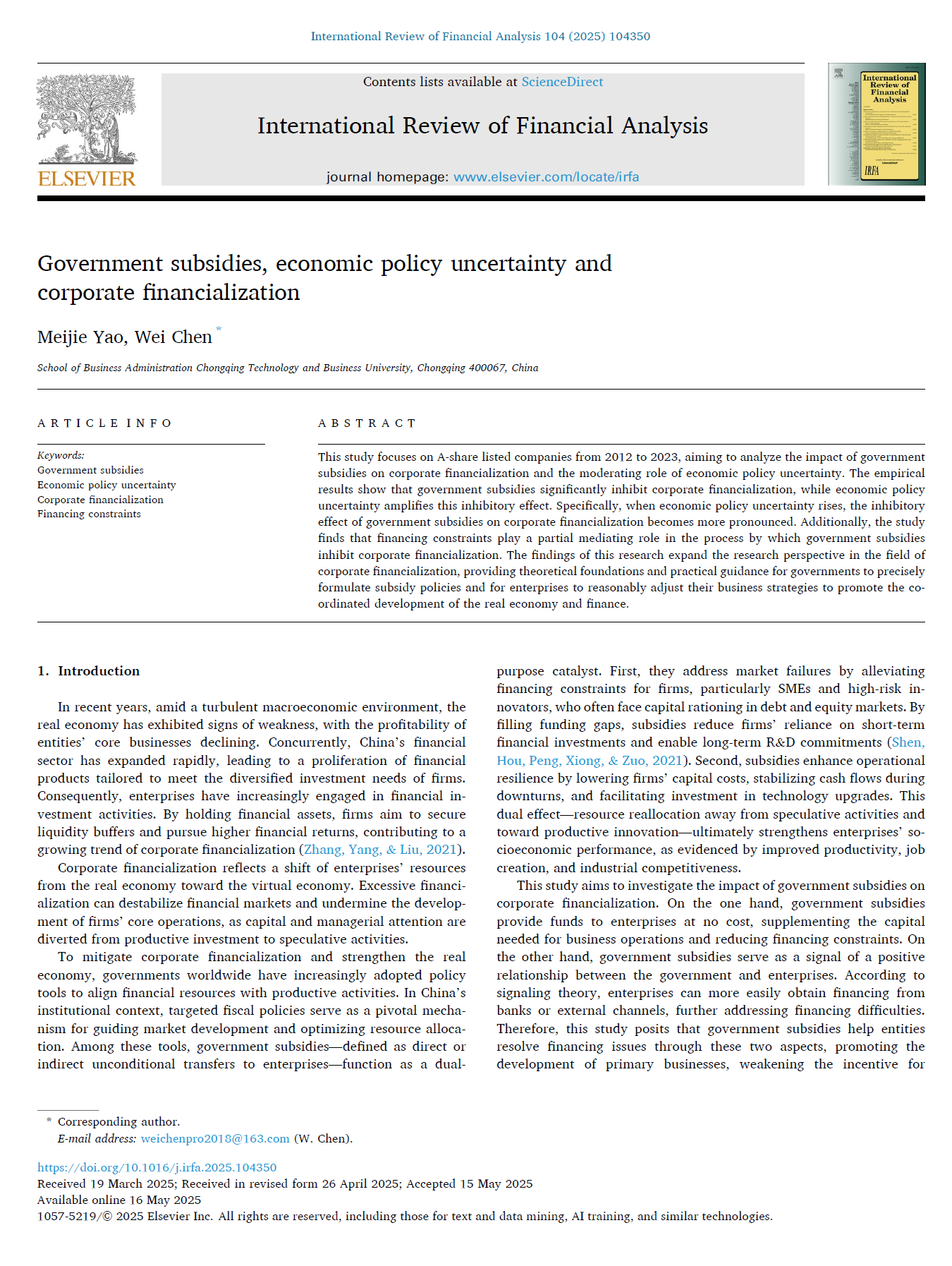Yao M(姚梅洁), Chen W(陈伟). Government subsidies, economic policy uncertainty and corporate financialization[J]. International Review of Financial Analysis, 104(2025)104350.(中科院SSCI二区Top期刊,ABS三星期刊)