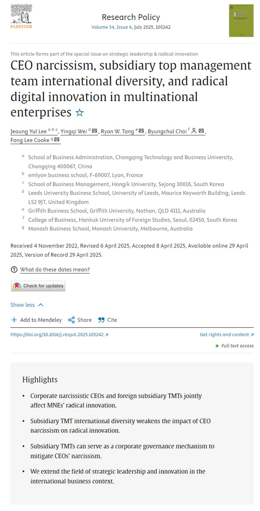 Lee J Y, Wei Y, Tang R W, et al. CEO narcissism, subsidiary top management team international diversity, and radical digital innovation in multinational enterprises[J]. Research Policy, 2025, 54(6): 105242.(FT50期刊)