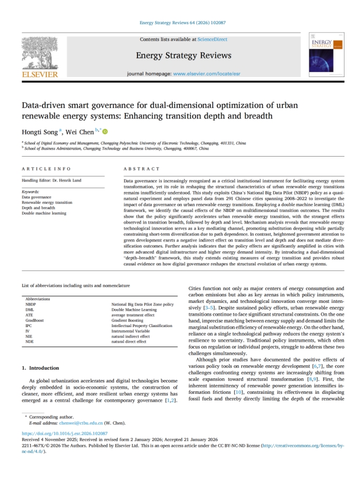 Song H T, Chen W*(通讯作者). Data-driven smart governance for dual-dimensional optimization of urban renewable energy systems: Enhancing transition depth and breadth[J]. Energy Strategy Reviews (SCI JCR Q1,中科院SCI二区期刊). 2026, 64: 102087. https://doi.org/10.1016/j.esr.2026.102087.