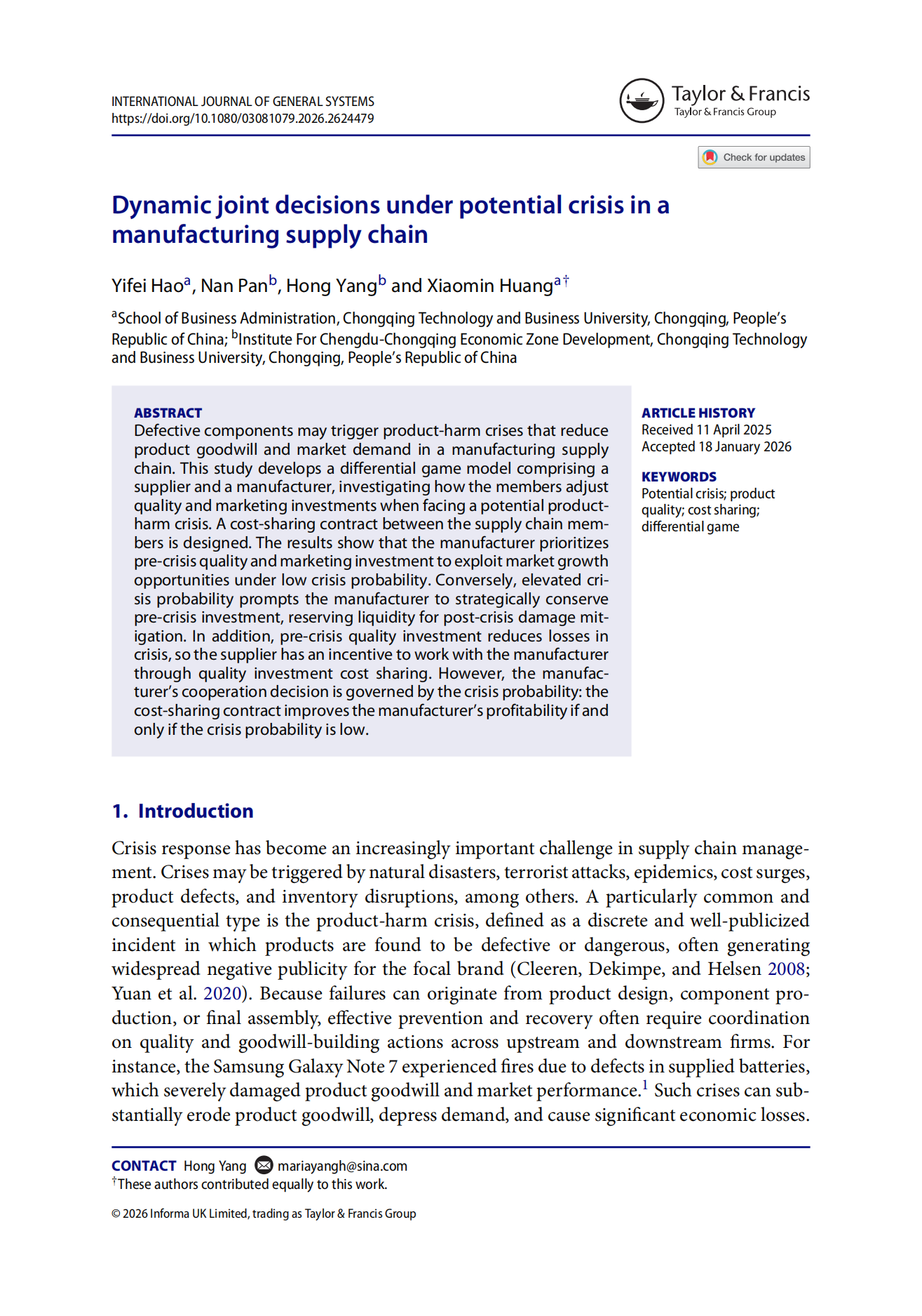 Hao Y F, Pan N , Yang H(通讯作者), Huang X M. Dynamic joint decisions under potential crisis in a manufacturing supply chain[J]. International Journal of General Systems(SCIE, JCR Q2,中科院SCI四区期刊), 2026. https://doi.org/10.1080/03081079.2026.2624479.
