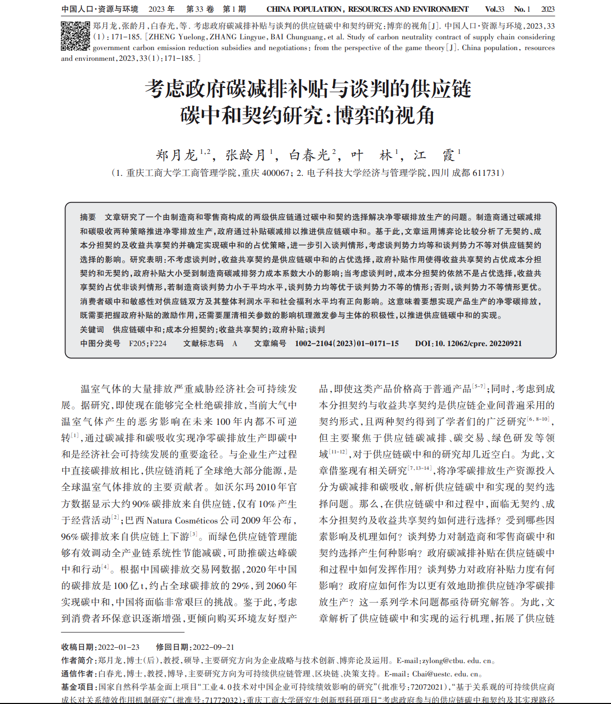 郑月龙, 张龄月, 白春光, 叶林, 江霞. 考虑政府碳减排补贴与谈判的供应链碳中和契约研究:博弈的视角[J]. 中国人口·资源与环境, 2023, 33(01): 171-185.