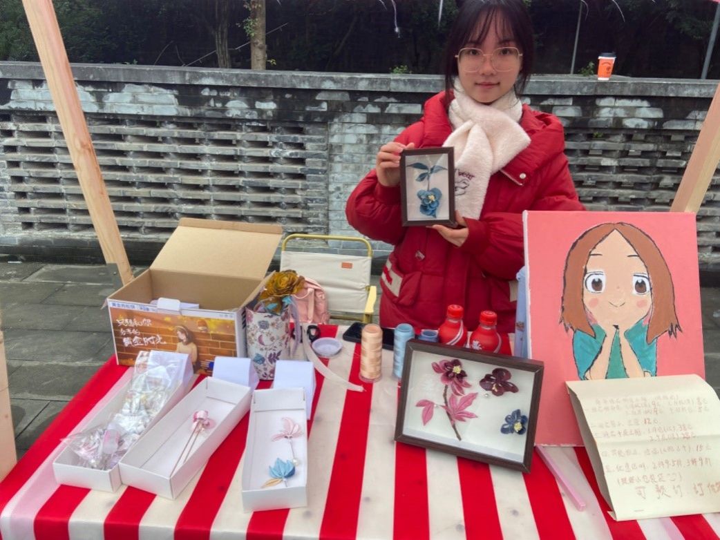 来自大三的文同学在现场演示了非遗缠花,其制作的胸针和装饰画样式精美,供不应求,文同学表示:“这是我第一次参加这样的活动,平时更多的时候是在自己的寝室进行一些创作,没想到大家这么喜欢我的作品,很感谢公司的提供的集市活动机会,也让我对非遗和手工艺行业有了更多的畅想。”
