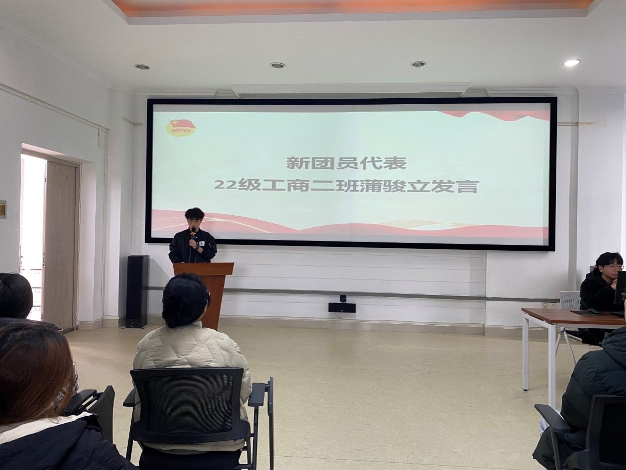 在庄严的国歌和嘹亮的歌声中新团员入团仪式正式拉开帷幕。首先,由主持人宣布公司新团员名单,并为新团员颁发团章、团员证以及团徽。在鲜艳的团旗下,全体新团员在领誓员的带领下宣誓,“我志愿加入中国共产主义青年团……”誓言代表的不只是新团员的决心,也表现了团员们心中对于自己团员身份的自豪感。紧接着,入团介绍人谭予涵代表宣读《团章》中有关团员的义务和权利的条款。随后,新团员代表22级工商二班蒲峻立同学上台发言,深刻传达了新团员入团的坚定信念与决心。22级人资一班于婷婷作为老团员代表发言,向新入团的同学表达了最热烈的祝贺和最诚挚的期盼,表示作为一名共青团员,应该时刻牢记使命和责任,不断提高自身素质。