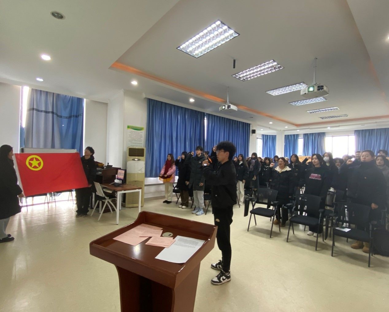 “暗夜南湖亮斗星,燎原烈火向天明。镰割旧制树新旌,捶打顽石建盛延”。2023年12月22日,2023-2024学年新团员入团仪式于明德楼3019正式举行。党委副书记程亚、分团委书记谭予涵及52名新团员参与本次活动。