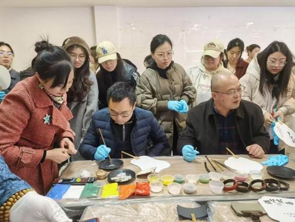 通过黄祥艳讲解,同学们深入了解了漆器艺术的历史渊源、制作工艺及其独特的美学价值,增长了对非物质文化遗产的认识,进一步激发了对中华优秀传统文化的自豪感与认同感。实操体验环节,在陈芷月女士的悉心引领下,同学们亲手尝试了漆器的基本制作过程,亲自感受了匠人的专注与耐心,体验了从无到有的创作乐趣,深化了对“工匠精神”的理解和尊重。